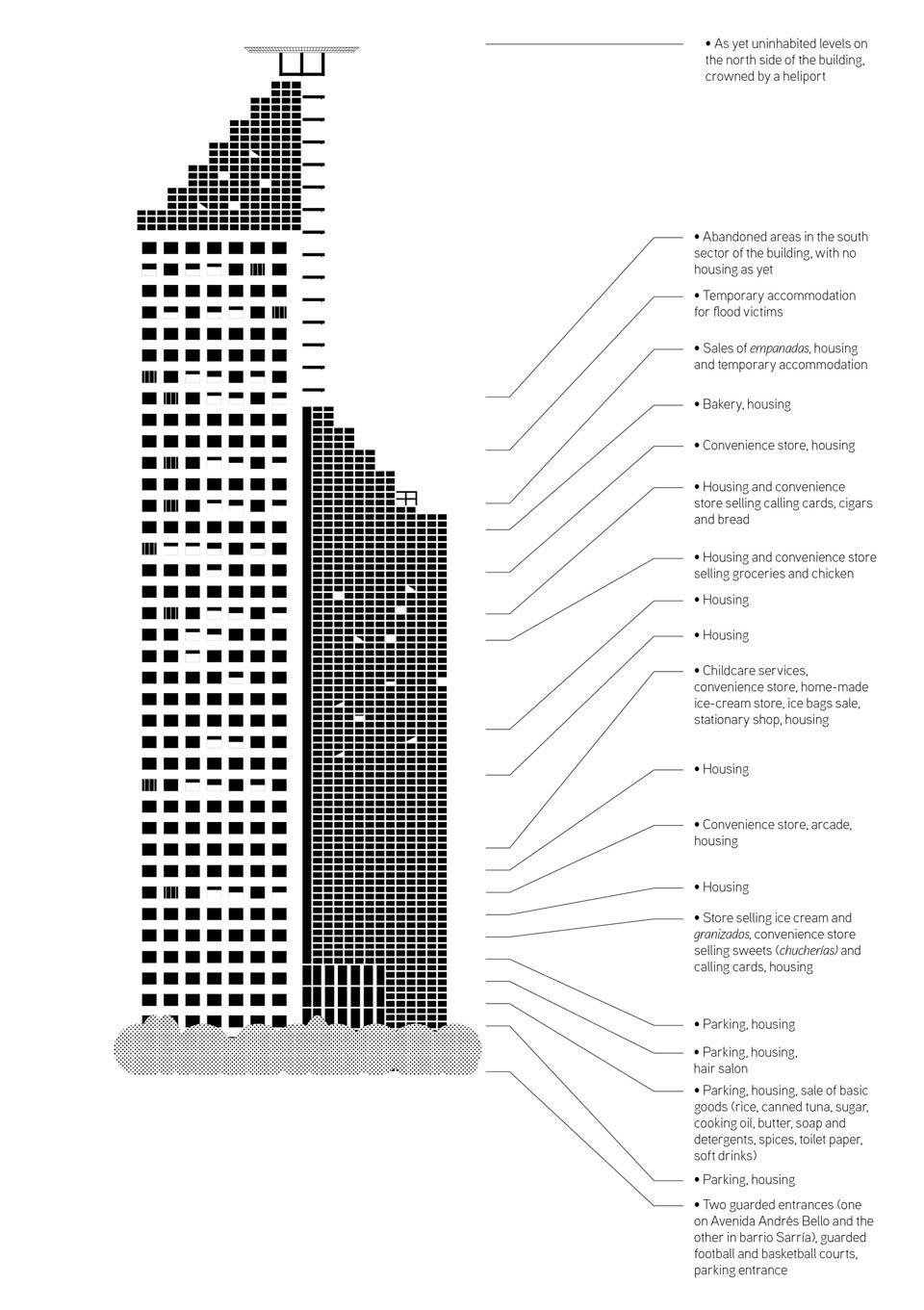 The “Tower of David” is currently home to 2,500 people. Over time it has become a city within a city: 800 homes, shops, beauty salons, Internet cafes, a football pitch, a basketball court and an evangelical church. Those who live in the building must comply with a set of written rules established by the community.On the contrary. Firstly, we approached the object from an ethical distance and we didn’t regard it as a «freak» phenomenon to be exploited. If we didn’t achieve that, then the work is at a loss from the very outset. The tower is not «a topic», nor a theme park, but a space-object where situations converge that enable us to observe, research and develop a project from different disciplines we are interested in. We want to deal with a general problem that has specific historical, economic, political, and demographic implications. The tower is an object, among many others, that represents the lack of synchrony between deeds and words; it is a symptomatic space, not a spectacle. The people who live there are not acting out a play or performing, they are finding a solution to an issue affecting their lives.What’s more, the tower is not unique or isolated, but is part of a permanent absence and presence: the absence of decisions to confront a problem and the presence of a group of people trying to survive. In this case, there’s a contrast because instead of being on a piece of wasteland, on the peripheries, or up on a hill, this situation is occurring in an abandoned building, an aspirational skyscraper, that is really a container that molds itself and assimilates what’s outside it for a common cause: survival. And this in turn represents another void: that of financial controls and another struggle between political and economic power. Ultimately, all we are doing is focusing on the imprint that power leaves in its wake: a void in solving problems and the massive amount of bureaucracy concentrated in the offices where decisions are made. That is the real theme park. The tower is a reality that is as human as geometry.There are other cities, like Johannesburg, that have similar cases.