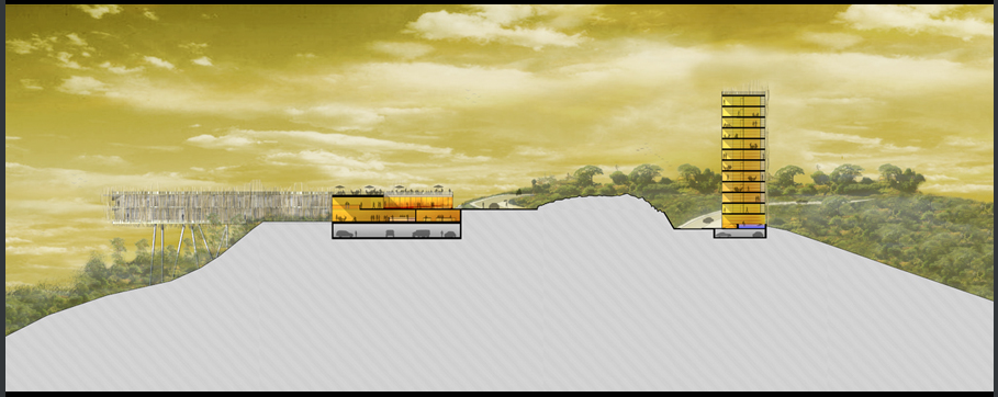 The hill of montage which looms over the city of cayenne (French guyana) provides a dramatic backdrop for the proposed project which encompasses a hotel, convention center, casino and residences. The project proposes to conceive as much of the hill as possible and creates a public park at the crown of the hill with panoramic views of the dramatic landscape The project acts as a pincer which attaches itself to the sides of the hill, keeping its footprint minimal and hovering above the ground in order to provide the occupants with the unforgettable experience of living amongst the treetops and being fully immersed in nature