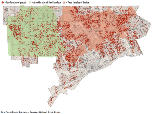 Este cambio ha tenido un efecto dramático sobre el paisaje urbano de Detroit, que generalmente está siendo descrito como «decaimiento urbano» o «pradera urbana«. Esto es un paisaje de vacío y desolación. Actualmente hay aproximadamente 33,000 parcelas vacías y casas desocupadas y abandonadas, y la tasa de vacante residencial es de aproximadamente 30%. La tierra y propiedades sin uso alcanzan un tercio del área total de Detroit, 40 millas cuadradas, lo que representa aproximadamente el tamaño de San Francisco 2.