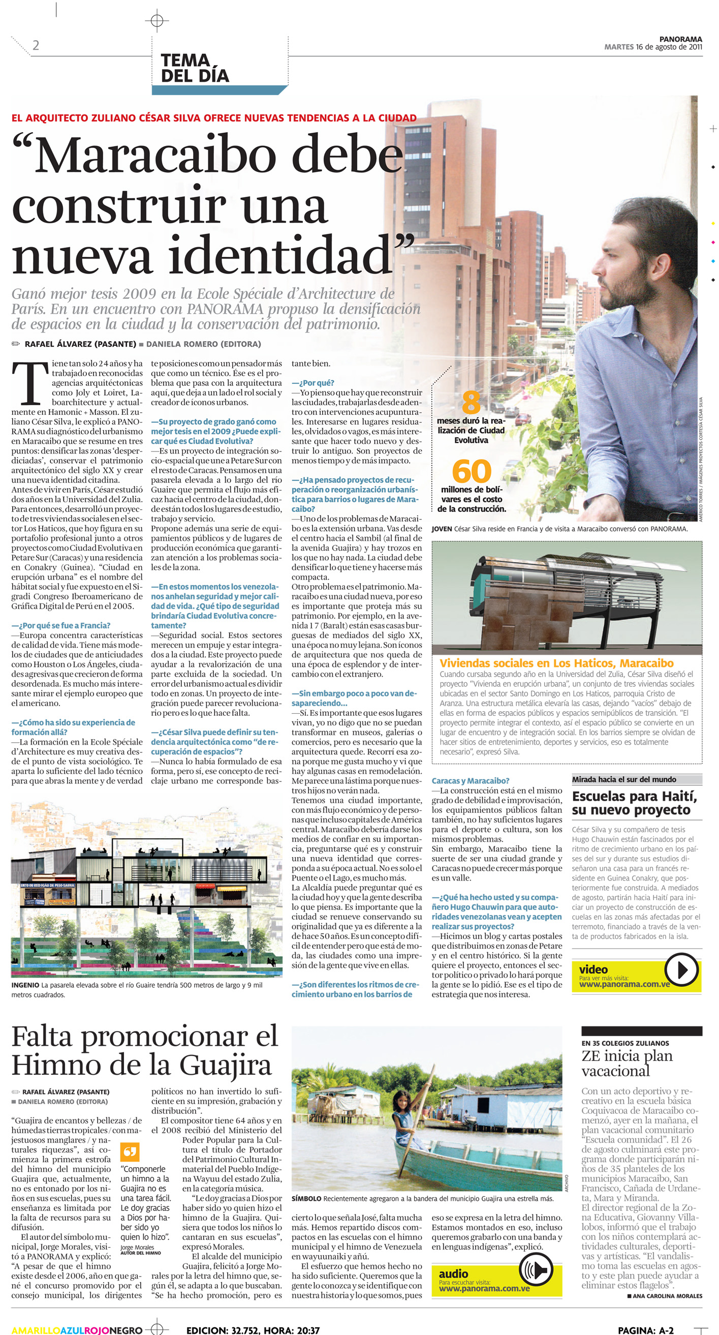 Le projet CIUDAD EVOLUTIVA a attiré l’attention du principal et plus ancien journal de l’ouest du pays, le journal PANORAMA. Le journaliste Rafael Alvarez sous la direction de Daniela Romero a realisé un article, ainsi qu’interview au sujet de ce projet et la question urbaine de la deuxieme ville du Venezuela et capitale «pétrolière du pays». La ville de Maracaibo