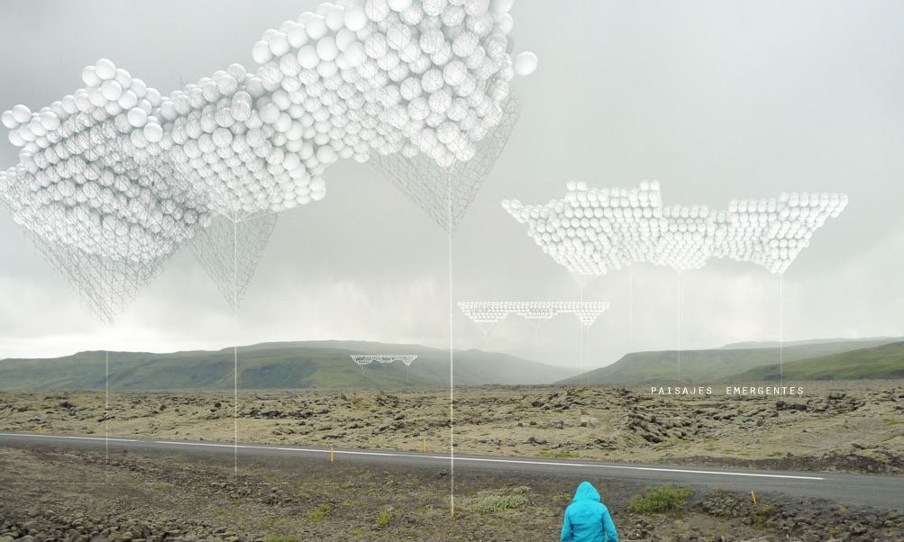 Otra línea de investigación importante que persigue Paisajes Emergentes podría ser descrita bajo el término: atmósferas. Al empujar su arquitectura al límite de la representación objetual, más allá de la cuestión de la tierra, hacia el ámbito del clima y la humedad, el colectivo ha desarrollado propuestas a base de neumáticos y la suspensión aérea. En una serie de proyectos, incluyendo su diseño para la monumental estructura en Nueva York u otras ciudades de América del Norte, para el desmantelamiento del aeropuerto de Heathrow a través de una guerrilla de globos, y para la conmemoración de las comunidades afectadas por la planta hidroeléctrica de Ituango en su Colombia natal, Paisajes Emergentes propone una nueva era de inflables.
